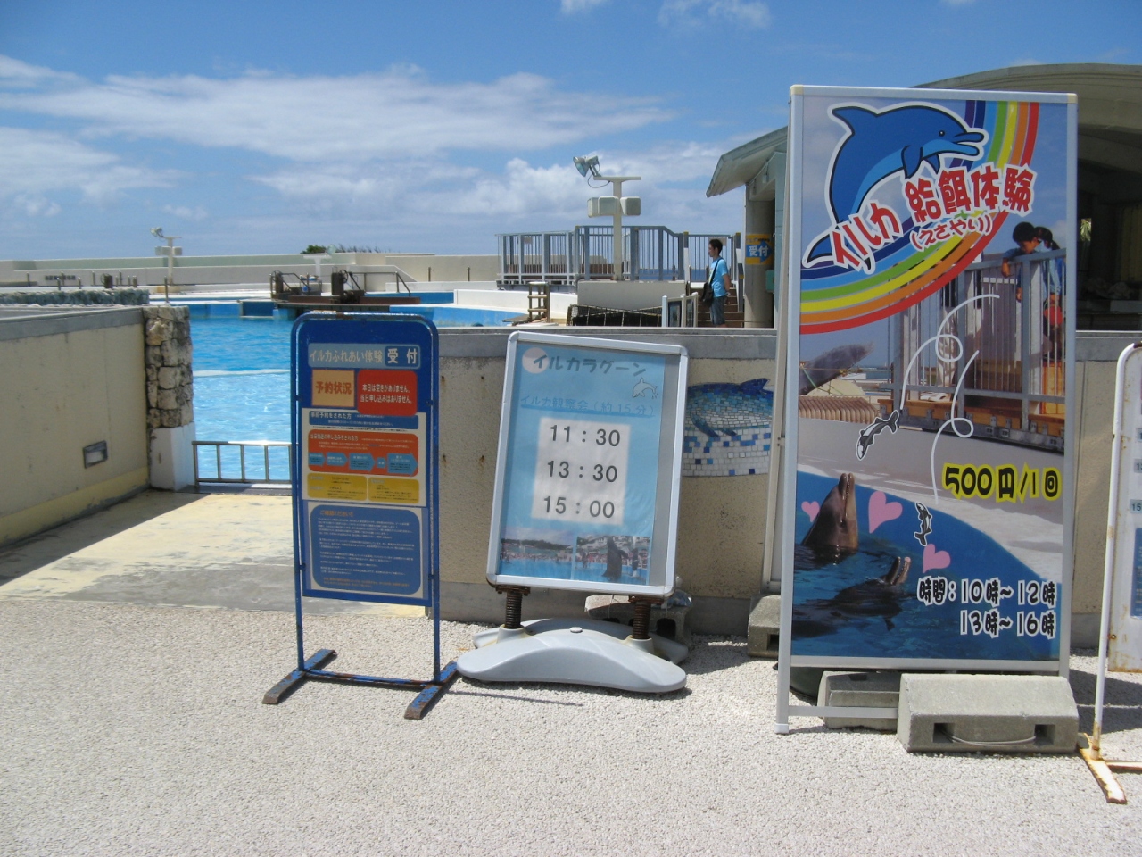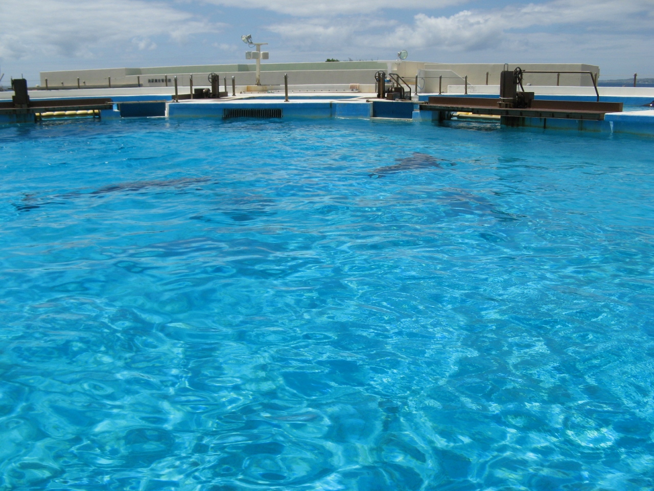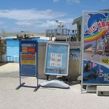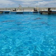 海洋博公園内で無料で観ることが出来る施設の一つで、大きなプールの様なところにイルカが飼育・展示されています。