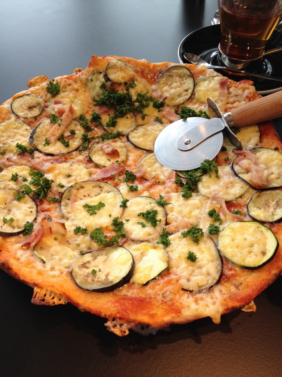 11時から12時まで、数量限定でピザセットが500円(税込)。お高いカフェなのにお得です。ランチ前の空席を埋める作戦でしょう。お皿いっぱいの大きさにビックリ。ベーコンとズッキーニ、ナスもたくさんのっています。パセリは??やはりバジルのほうがgoodかと。クリスピータイプであっさりと楽勝でいただけました。ドリンクも付いて言うことなし(笑)ごちそうさまでした。ただ、クッションのない硬い椅子に座ったので、お尻が痛くて、長居はできませんでした。