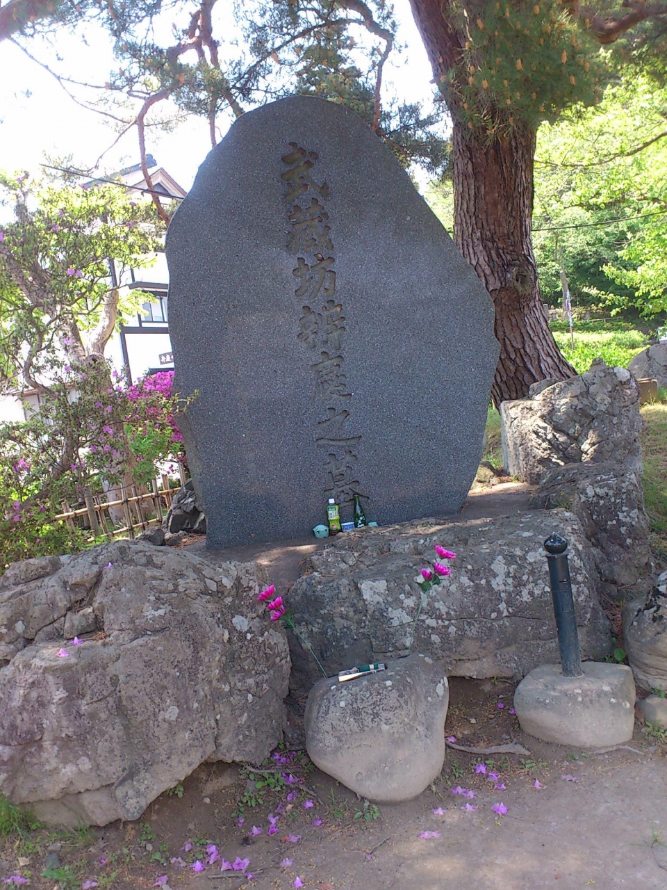 平泉るんるんバスの中尊寺バス停で降り、月見坂へ向かう方向に小さな園地があり、その中にあります。弁慶の墓と刻まれた大きな墓石があります。ただし、この墓石しかありませんし、まわりが囲まれているので、通り掛っただけでは見過ごしてしまうかもしれませんので、注意が必要です。