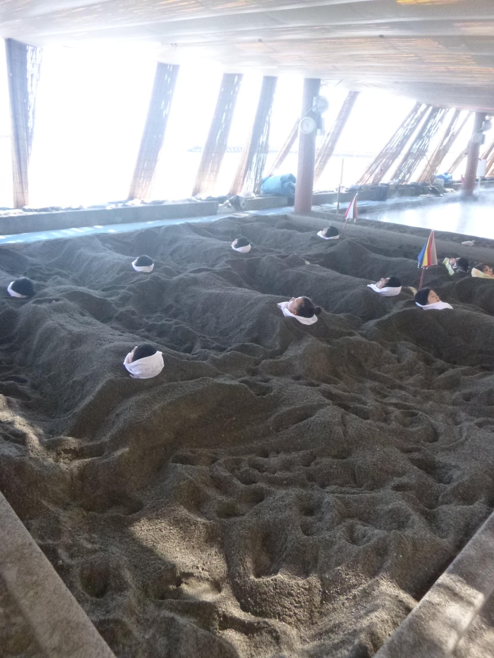 指宿で有名な観光スポット、砂蒸し風呂。ガイドブックなどでも一番有名なここに行きました。海岸に隣接していて、浴衣に着替えて海岸の専用スペースで砂に埋めてもらいます。大体15分くらいが目安と言われますが、自分で出る時間は調整していいとの事でした。子供でも体験でき、熱すぎないように砂の量を調整してくれるので子供でも楽しめました。