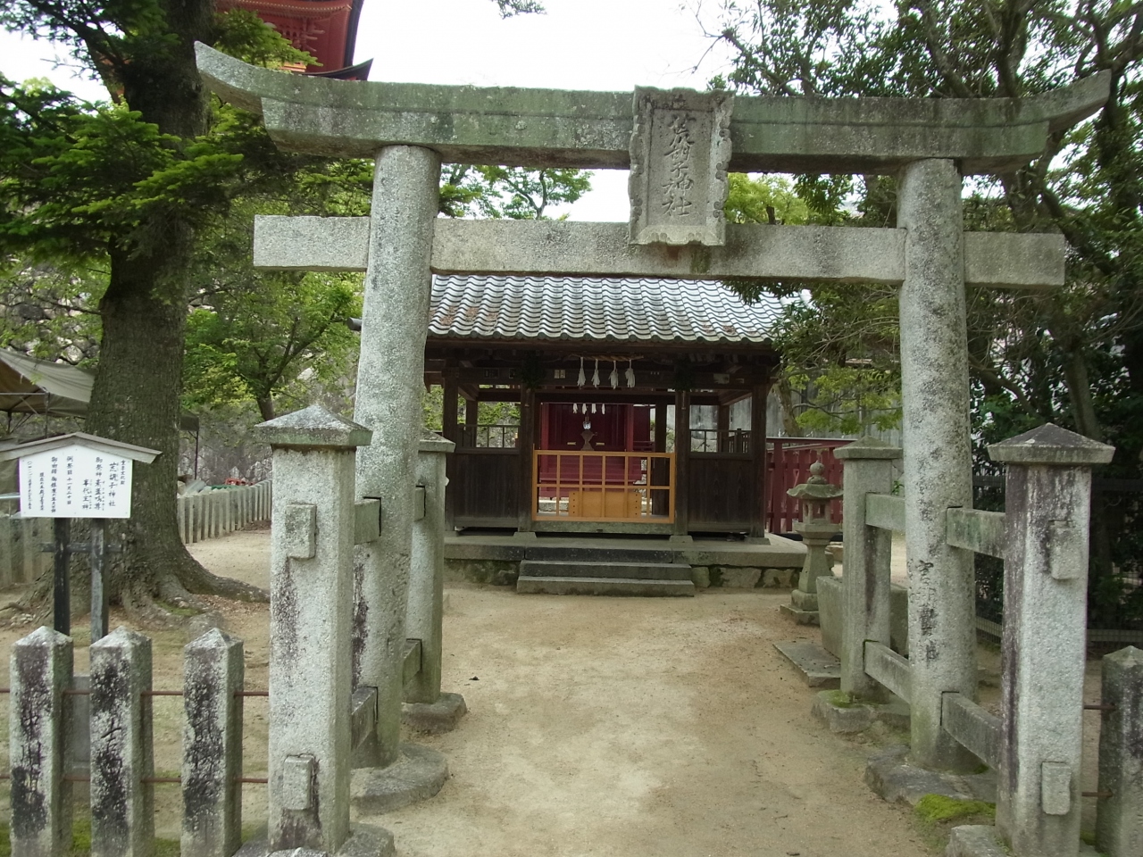 厳島神社の東回廊入口を過ぎてすぐ左手にあります。正直、存在感がないのでほとんどの人が通り過ぎていきます。右手に厳島神社があるので仕方ないですが。朱漆塗りの社殿はこうみえても国の重要文化財です。御鎮座の年月は不詳、現在の本殿は1411年に造営されたものです。