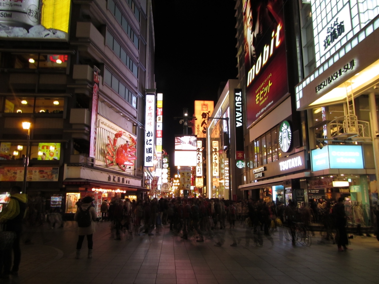 大阪の象徴道頓堀。散策するなら夜がいい。派手な巨大看板やたこ焼き、お好み焼きといった大阪グルメに観光客が賑わう。