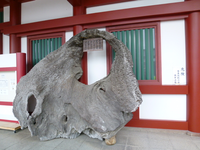 今回は宮島口よりフェリーに乗って、ここ宮島に来ています。ここは世界遺産である「厳島神社」で知られていますがその宝物館となります。厳島神社境内か近くにあるかな、と思っていましたが、ちょっと離れていて、大願寺の前にありますので間違いのないように。国宝である平家納経やよろい、数々の重要文化財を収蔵しています。宝物館前に、大鳥居に使用されていた「楠」の旧根元材が展示されていますが、写真を撮影する時に後ろのひゅっくり返らないように注意してくださいね。