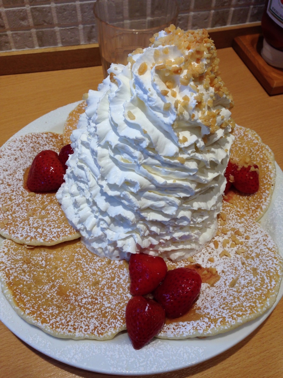 イチゴのパンケーキを頼んだのですが、相変わらずすごい生クリームで、どうしても食べきれずに半分弱残してしまいました。