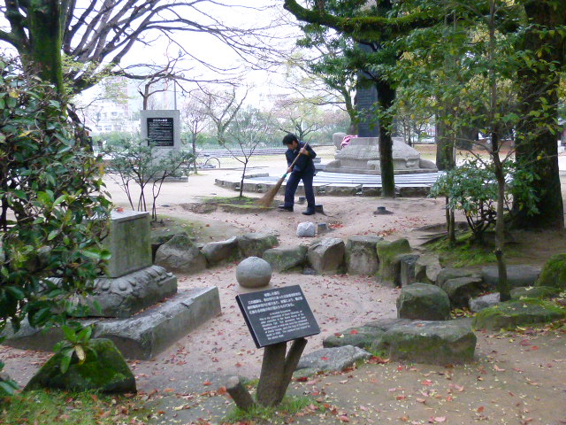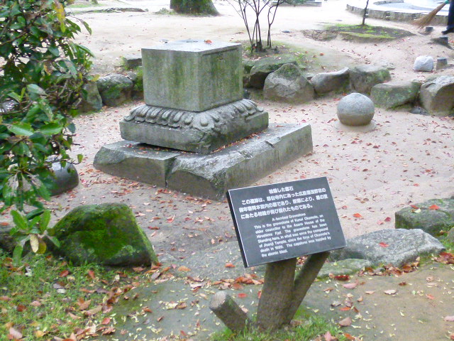 本川に架かる本川橋に近い平和記念公園内の木々に囲まれた中に平和乃観音像のすぐ後ろにあるのが被爆した慈仙寺跡の墓石です。中島地区にあった慈仙寺は原爆によって境内にあった重い墓石が吹き飛ばされたそうです。なんだかひっそり墓石があって忘れてはいけない悲惨な大参事を伝えるかのように思います。