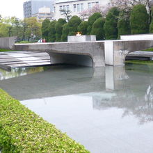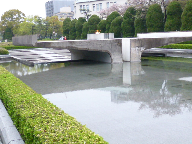 平和記念公園にある平和の灯があります。南西から見ると平和の池がよく見えます。池の中に設置された原爆志望者慰霊碑の碑文には、原爆犠牲者の冥福を祈り、戦争という過ちを再び繰り返さないことを誓い、世界平和を祈念する広島の心が刻まれていて日本語以外に韓国語やロシア語、ドイツ語や英語、フランス語やイタリ語、中国語などで紹介されていて、訪れる人々にわかりやすく案内されていました。並んで平和の池の表示板もご覧いただけます。