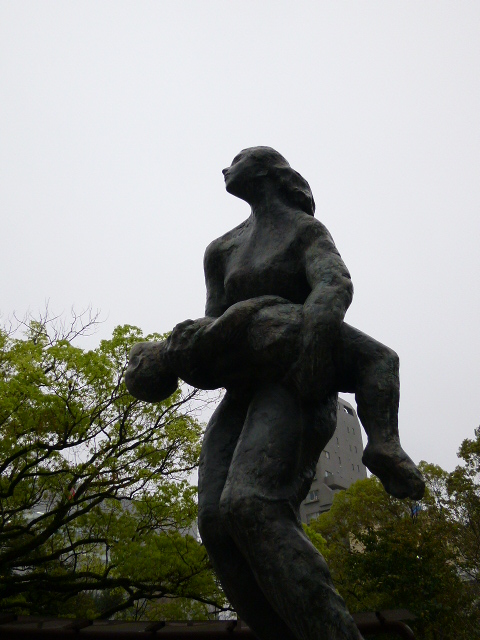 本川に架かる西平和橋に近い平和大通り沿いにあります。芥川永氏の作品の被爆した教師がぐったりとした子供を抱えている像は、被爆当時の情景が思い浮かぶような情景や緊迫した様子がよくわかるブロンズ像でした。台座部分には歌人で知られる正田篠枝さんの短歌が刻まれていました。