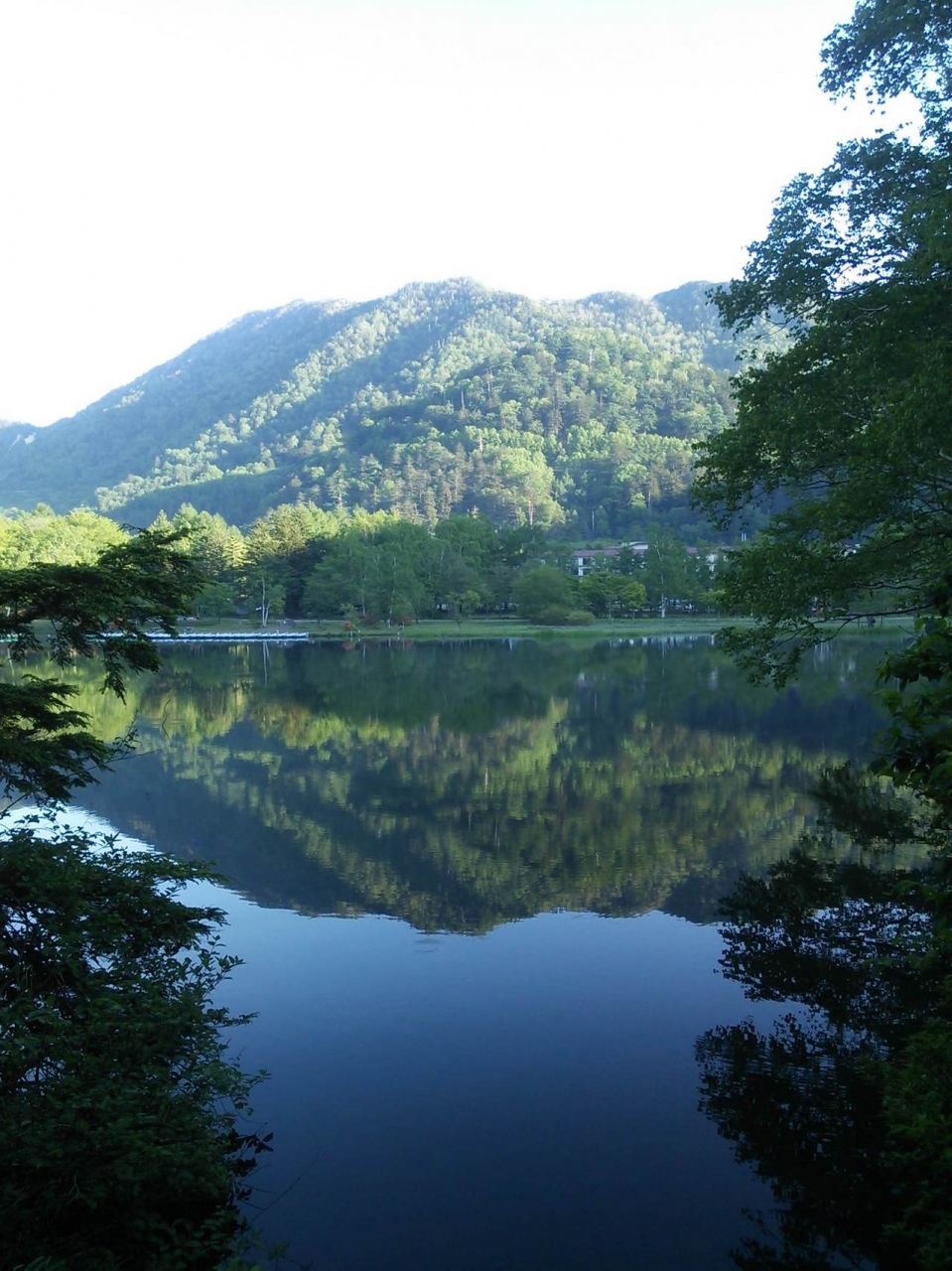 湖面が穏やかなためにキレイに湖面に景色が映ります。朝の散歩で撮影しました。キレイでした。