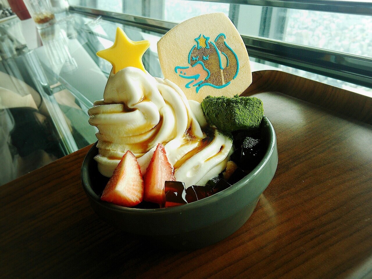 スカイツリー展望デッキフロア340にあるカフェです。ランチタイムと時間がずれていたせいか待ち時間なく入店できました。最初に注文&支払いを済ませ、席に持っていくという、セルフタイプのカフェです。窓際のスカイビューの席が取れました。注文したのはテッペンペンサンデーです。ソフトクリームに黒蜜がかかって、イチゴやゼリーが添えてあります。料金は800円。東京の街を高所から見ながら甘味を楽しむのもなかなかいいものですよ。