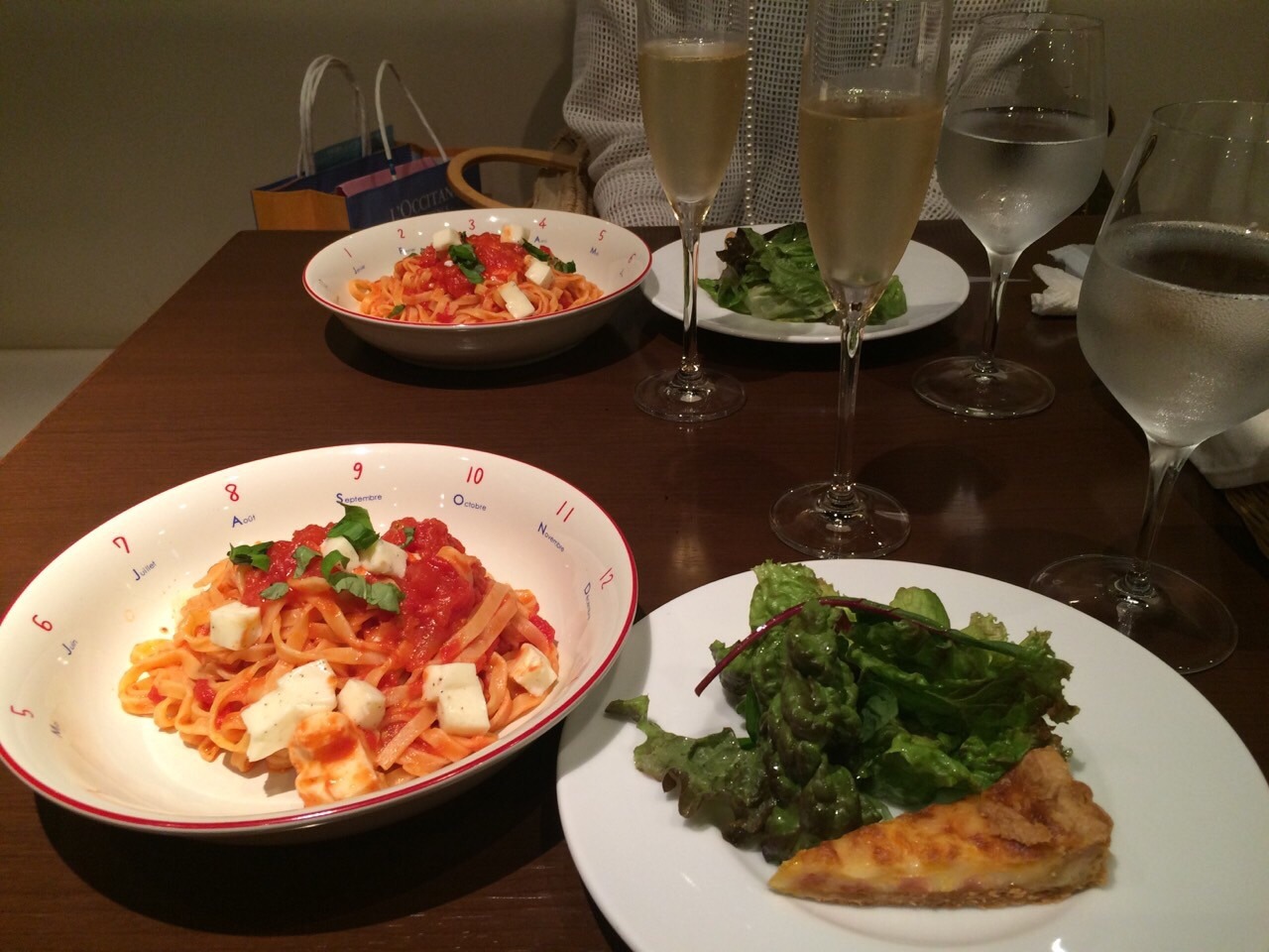 新地にありますビストロシャンパーニュへ行きました。2回目の訪問です。ランチは千円です。サラダにキッシュ、パスタは2種類から選びます。あと、ラミの食パンは食べ放題、コーヒー茶菓子がついて、千円です。私達は追加で750円たしてロールキャベツを頂きました。あともう一つはポワレでした。