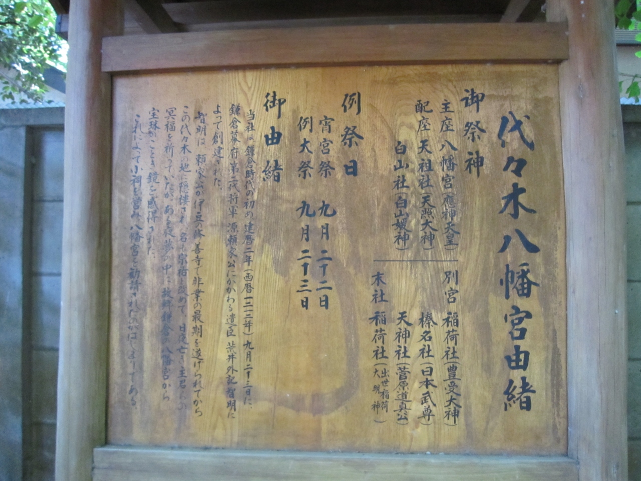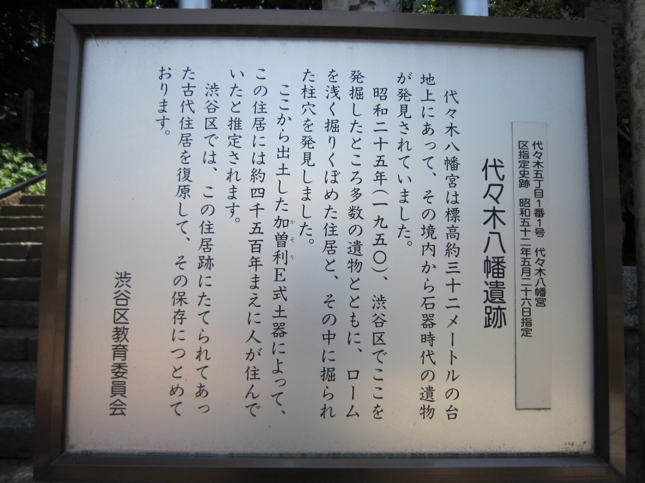 小田急線代々木八幡駅を出て山手通り新宿方面へ直ぐです。歴史があり遺跡のある神社です。山手通りから入ると一の鳥居、二の鳥居、鬱蒼とした木々の中、代々木八幡遺跡がありその先に本殿がありました。場所が都心であり参拝客が多く見受けられるました。本殿では結婚式をしていました。境内には遺跡出土品展示室、宮神輿庫、本殿奥に榛名社、天神社、稲荷社が横に並び奥に出世稲荷社がありました。都会の中にあり非常に静かで落ち着ける所でした。
