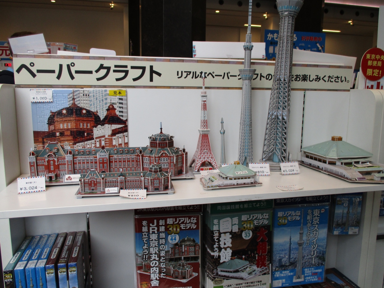 キッテが出来る前のこの郵便局は建物こそ重厚でしたが、こんなに見る楽しみがなかったです。今は郵便局窓口前にいろんなものを売っています。東京駅やスカイツリーのペーパークラフト、買って作って飾ったら楽しいですね。