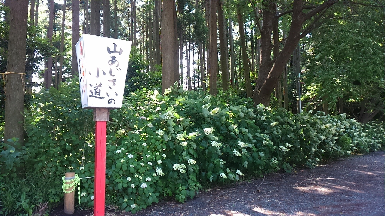 太郎坂からの階段脇と山あじさいの小道の前には、葉の形が柏の葉に似た白い柏葉紫陽花(カシワバアジサイ)が、美しく咲いていました。