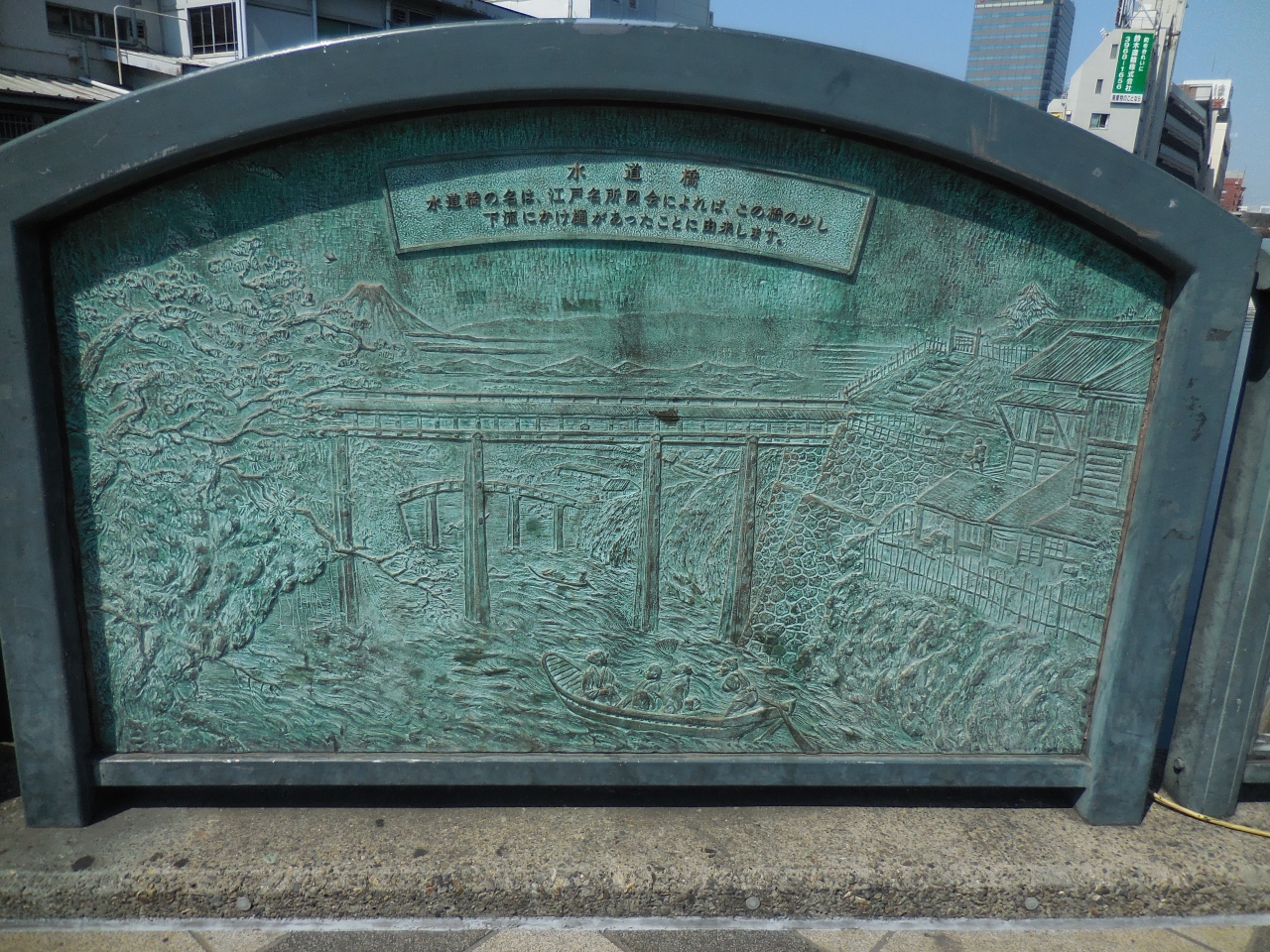 JR水道橋駅を出て東京ドーム方面以に行くには神田川をわたらなければなりませんが、東口の方から出たときにわたる橋が水道橋です。橋にある説明文によれば、橋の名前は今の橋の少し下流にかけ樋があったことに由来するそうですが、今では交通量の多い橋です。
