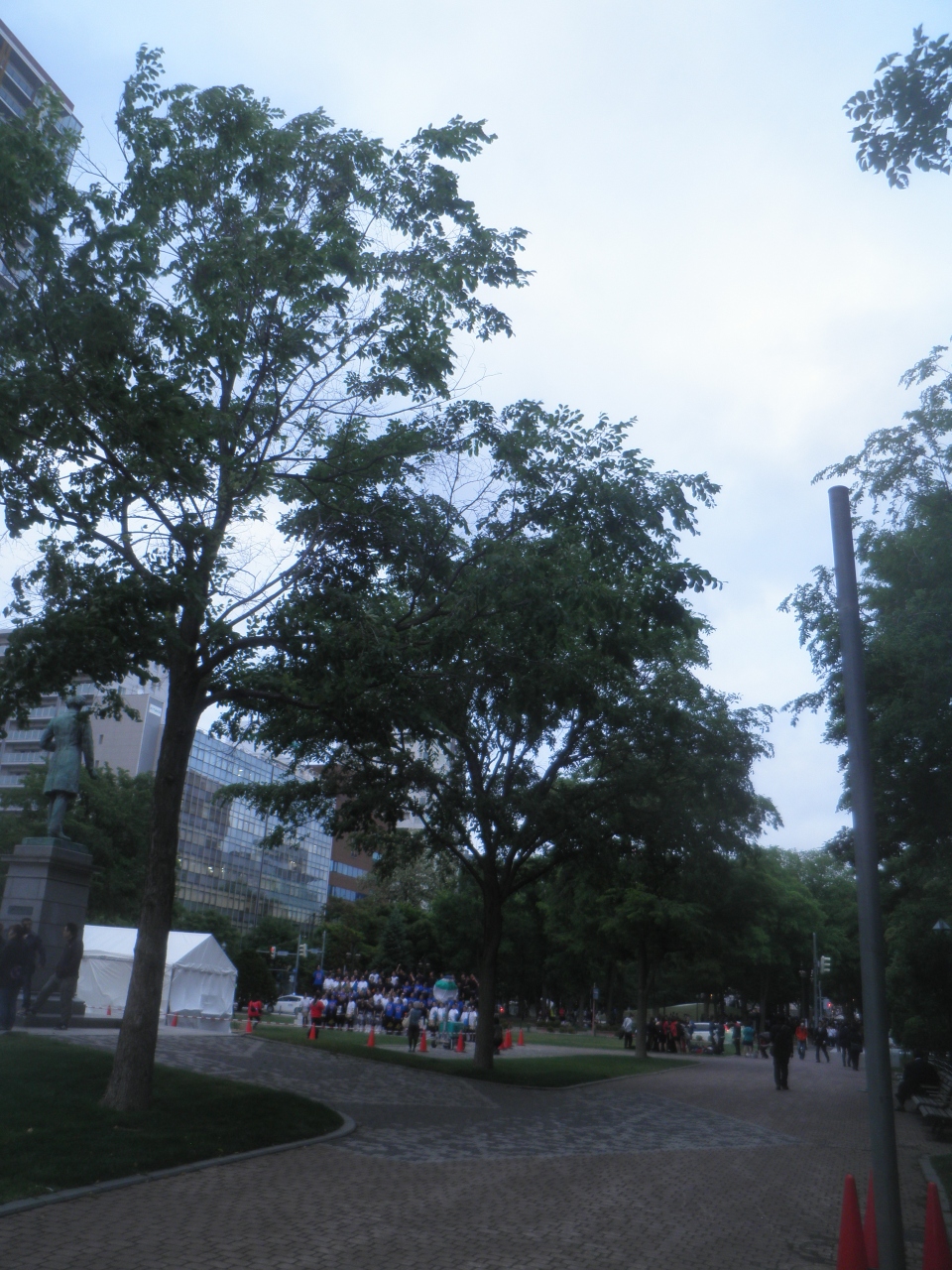 大通公園などを会場にして開催されているYOSAKOIソーラン祭りを初日に見にいきました。 大通公園ではお祭りの格好をした若者が元気よく駆け回っていました。 黒田清隆像とケプロン像の前では「ヨサコーイ!」と叫びながら並んで記念撮影をしていました。 夕方だったんでけっこう肌寒く、土日には大通公園周りで交通規制があるという看板がたっていました。