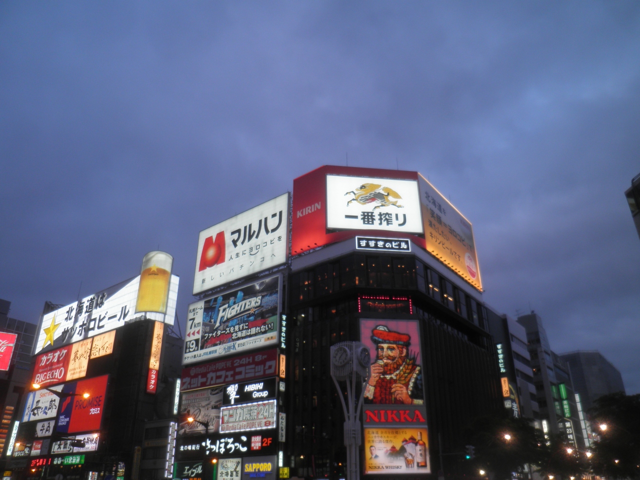 すすきのにラーメンを食べに行きました。サッポロラーメンが有名で、ラーメン横丁などにラーメン店が集合しているところもあるけど、あちらこちらに無数にあります。少し離れたところにある、最近話題のハングリーピッグ 札幌店でつけ麺をいただきました。ニンニクがきいておいしかったです。 帰りは自転車でネオンがきれいなすすきの交差点をぬけようとおもったけど、歩道は歩行者が多いので自転車を押して歩きました。