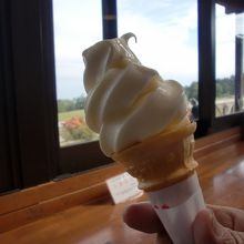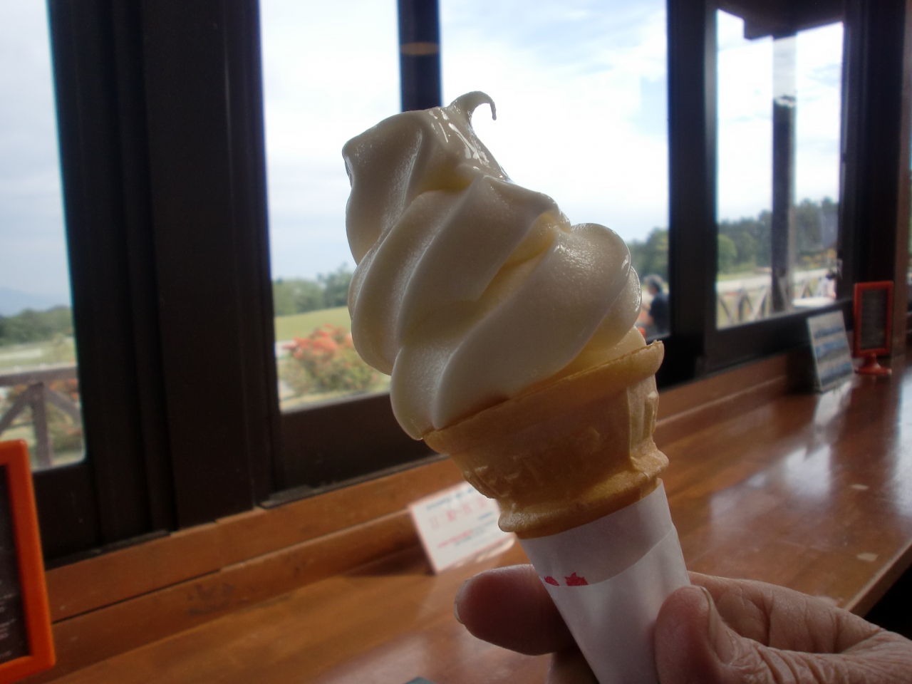 山小屋風な店舗の目の前には、きれいな山並みが見え、テラスのベンチで食べることもできます。風がふいていたので店内のカウンターにすわっていただきました。濃厚なソフトクリームはとっても美味しかった。1個400円でした。