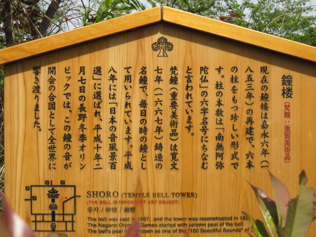 良い音の響きでした。日本の音百景や長野オリンピックでは開会の合図として響いたそうです。毎時に突かれるそうで午後3時の音を聞きました。寺男の人が突いていました。鐘を突いている写真は残念ながら間に合わず撮れなかったのですが、善光寺御開帳の雑踏の中、近くでじっくり聞いている観光客がいました。