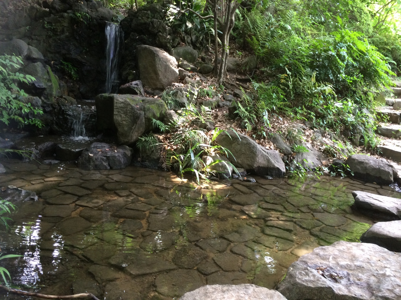斜面の地形を生かして、湧き出る水が小さな滝となって池に注いでいます。