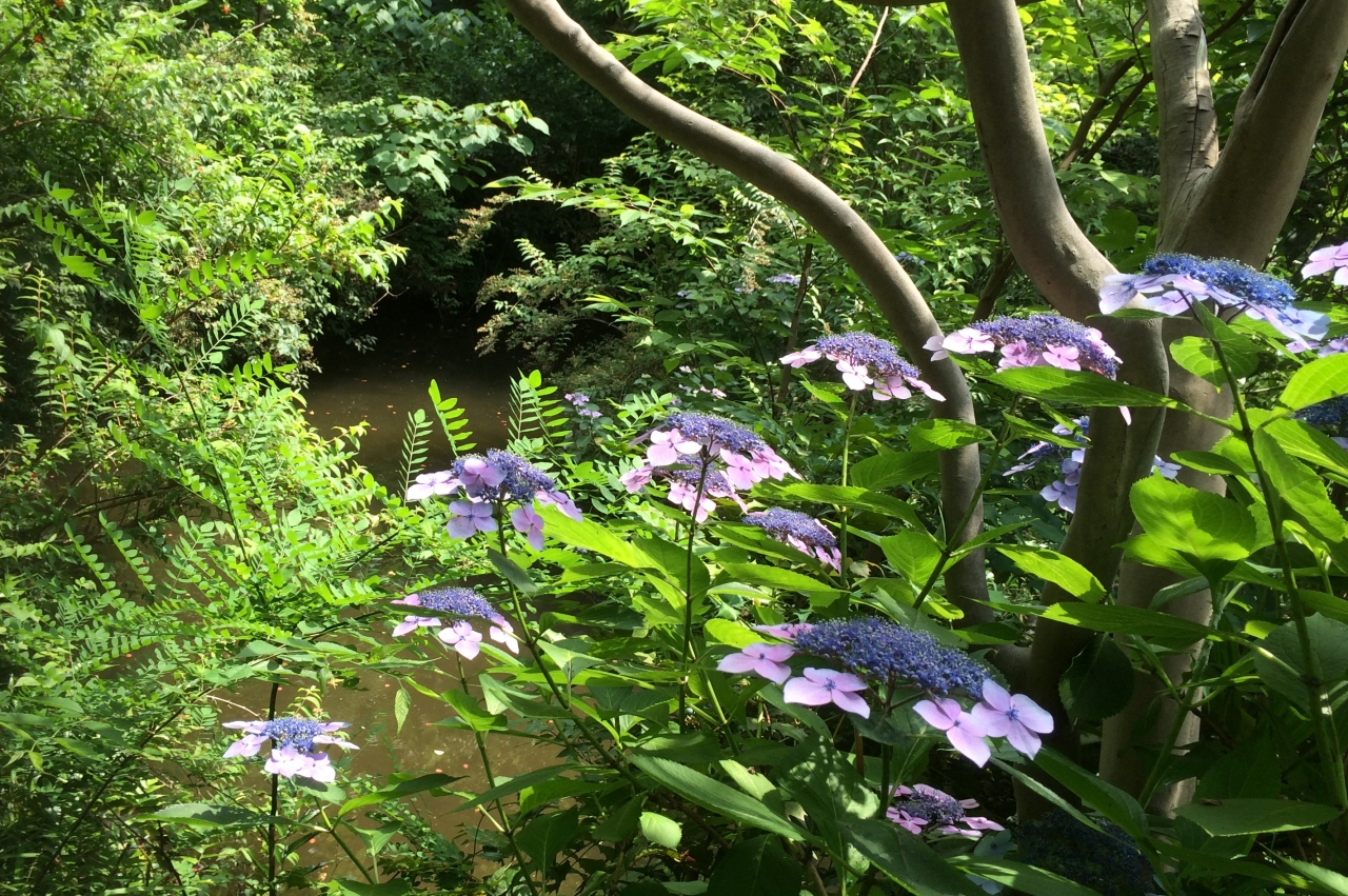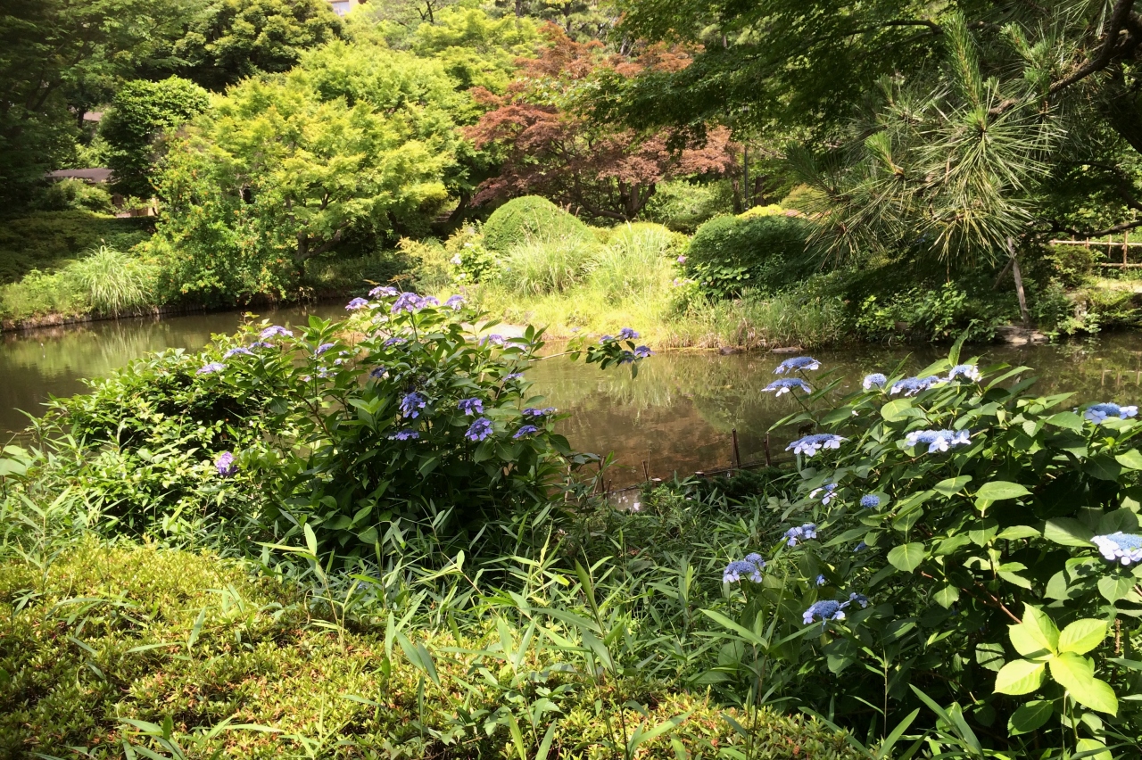 訪れた時はツツジが終わって、ちょうどアジサイが咲き誇っていました。新緑や紅葉、冬の雪吊りなど、四季折々に楽しめる区立唯一の回遊式庭園ということです。