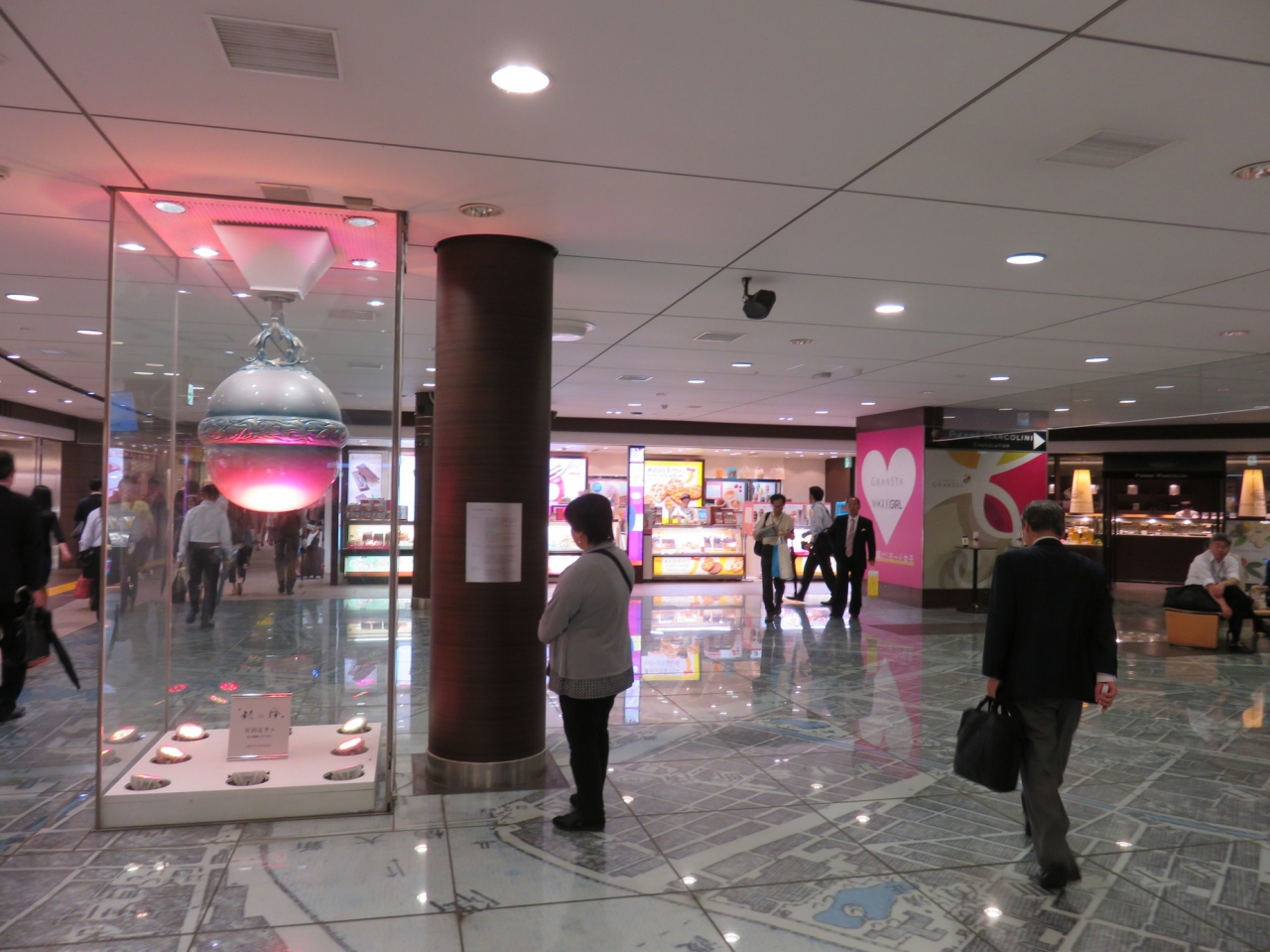 東京駅の八重洲側地下通路の脇にある店舗を一部どけたようなスペースになっていました。オブジェの銀の鈴は 地下通路寄りに配置され、ガラスケースに入れられ内部照明で綺麗に輝いていました。そこから壁方向に向かって広いスペースに椅子が配列されていました。待ち合わせスペースなので人が一杯座っていました。個人的には手前にある「びゅうスクエア」の方が使い勝手が良い気がします。