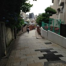 クルマ1台がやっと通れるような狭い道、なのに一方通行ではないという不思議な坂道です。
