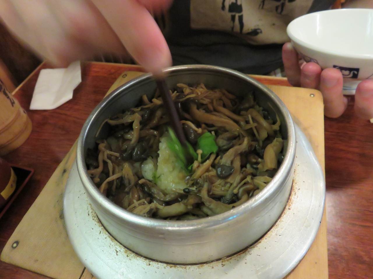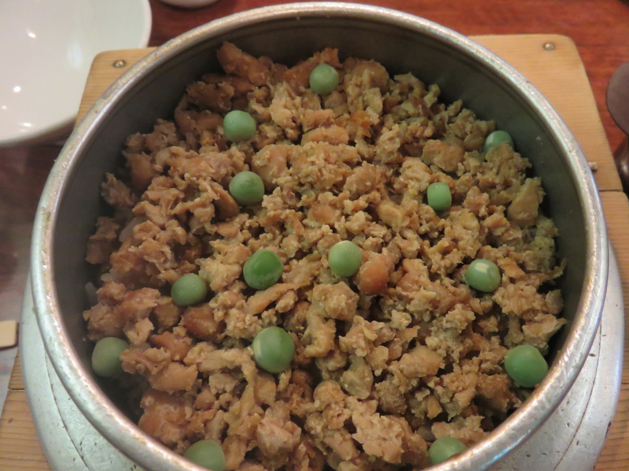 昼食を探してゴジラ像の前に来たのですが、気に行った食堂が無く、ビルの入り口の釜飯に惹かれて入りました。狭い階段を降りるのに抵抗がありましたが、店は広いスペースとなっていました。釜飯、漬物と味噌汁のセットになっていました。注文してから20~30分くらいで出てきました。御釜には軽い焦げが有り、移し替えでない事が判ります。少し浅めの御飯茶碗に4杯分くらいありました。女性の方はシェアした方が良い気がします。