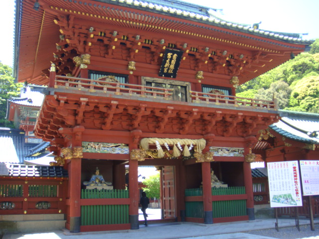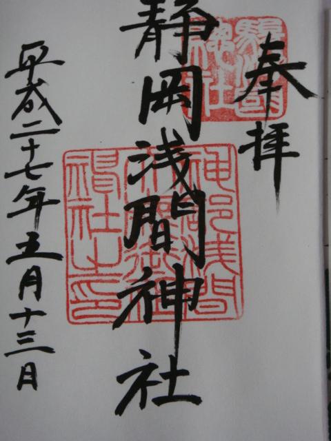 駿府城を見学後、参道の浅間通りを通り浅間神社へ向かいました。由緒書きによると、神部神社、浅間神社、大歳御祖神社の三社を総称して「静岡浅間神社」となっています。そのようなこともあり境内は広いです。また重厚な造りの社殿は鮮やかな色彩で、見るものを圧倒し、「東海の日光」と呼ばれるのもうなずけます。新緑のシーズンの今は裏手の山の緑に豪華な社殿が一層映えて綺麗です。参拝後社務所で御朱印をいただき帰りました。