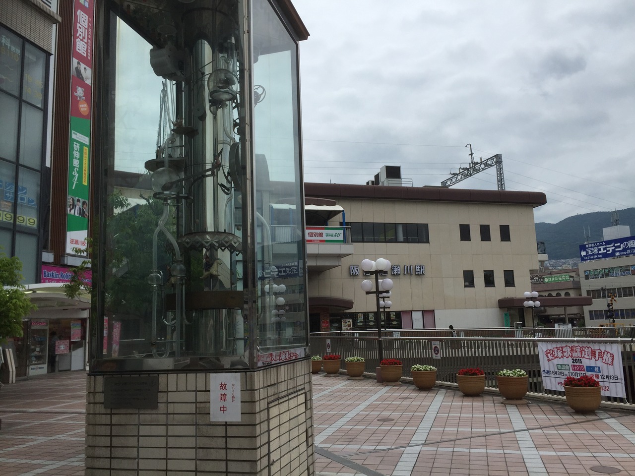 阪急逆瀬川駅は改札が地上から見て三階に位置する。駅前に面白いモニュメントがあるのだけど、ただいま故障修理中。