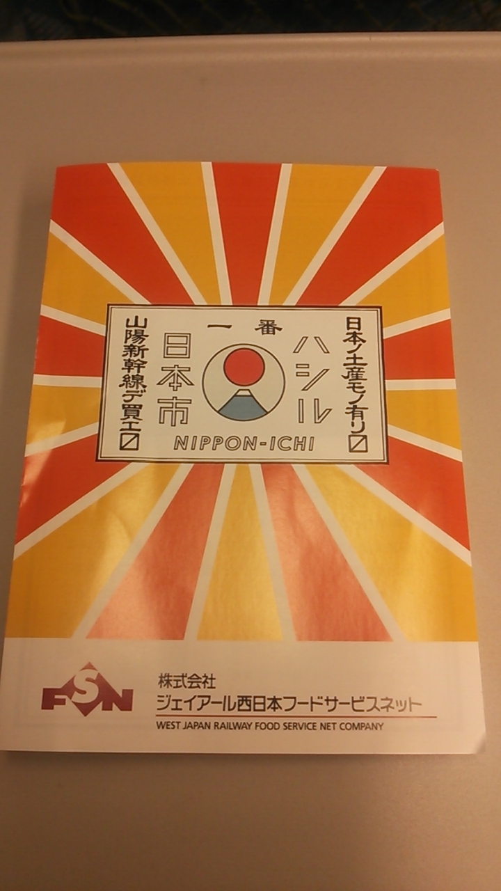 そのうち今回は山陽新幹線の車内販売についての情報です。山陽新幹線の車内販売ではお弁当・飲み物・おつまみ・アイスクリーム等の商品を取り扱っていますが、2015年6月14日に乗車したところ、「走る日本市」と称し、期間限定でJR西日本エリア各地の名産品等を販売しているそうです。乗車した日時点では山口県に関する商品が販売され、チーズ入り蒲鉾(550円位)、夏みかんジュレ(280円)、ふくハンカチ(1300円)等が売られていました。