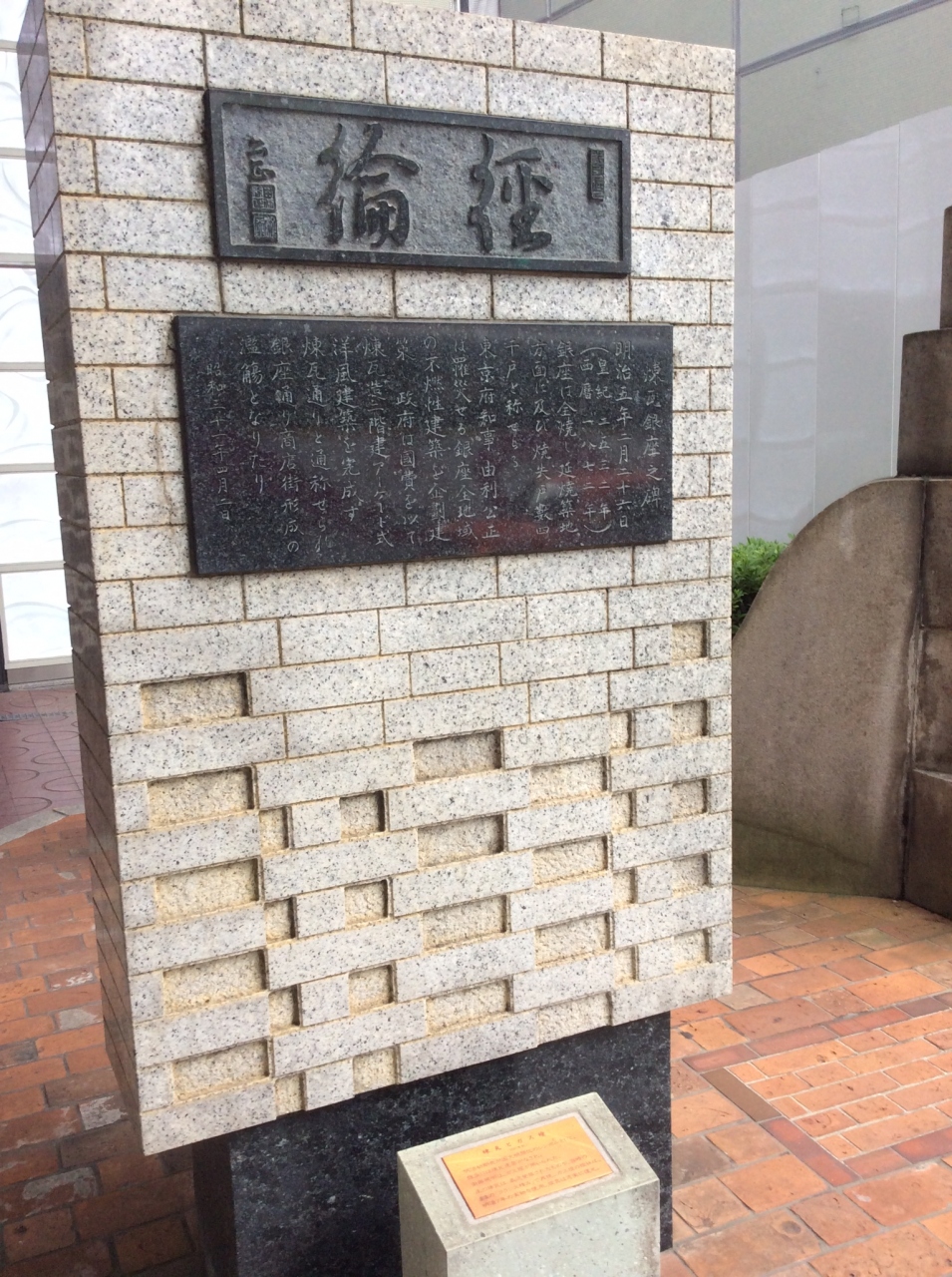 中央通り沿いの銀座通り口を越えた所で、警察博物館の前辺りにあります。明治5年の和田倉門からの出火が原因となった大火事の経験から、当時の東京府知事が不燃性都市の計画を進め、その結果銀座煉瓦が誕生したということです。