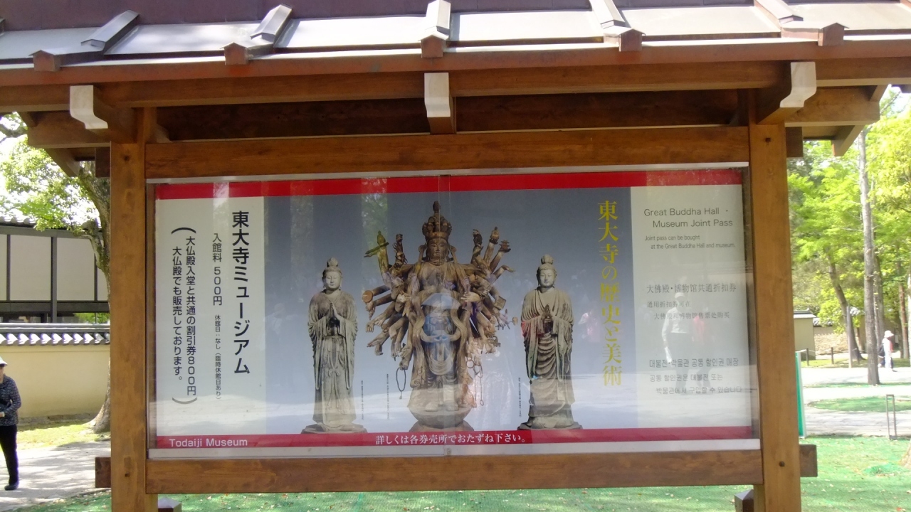 ならの有名観光スポットである東大寺。その境内の南大門を抜けてすぐの場所に、この「ミュージアム」があります。門や境内は無料ですが、ミュージアムは入館料500円です。歴史のある仏像が並んでいたり、詳しく説明があったりと、充実した展示内容でした。