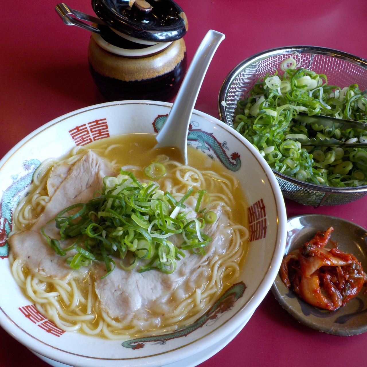 豚骨スープのラーメンには薄めのチャーシューしか入っていませんが、ざるに入った刻みネギが自由に入れ放題、キムチも食べ放題でした。