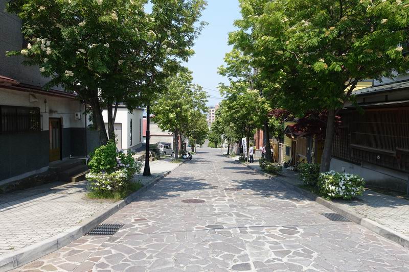 坂を上った所には観光客が多く訪れるカトリック元町教会、ハリストス正教会、聖ヨハネ教会があり、教会通りといった感じ。そこからさらに上へと続く坂は「チャチャ登り」と呼ばれ、道幅が狭くなっています。街路樹と石畳の坂道は風情があり、秋にはナナカマドが紅葉して美しいそうです。新緑もきれいでした。