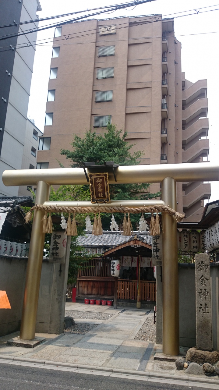 二条城の近く、住宅街の中にある神社です。御金と書いて『みかね』と読みます。お鳥居が金ぴかで、『御金』と書く神社なんて、すごく金運が上がりそうです!