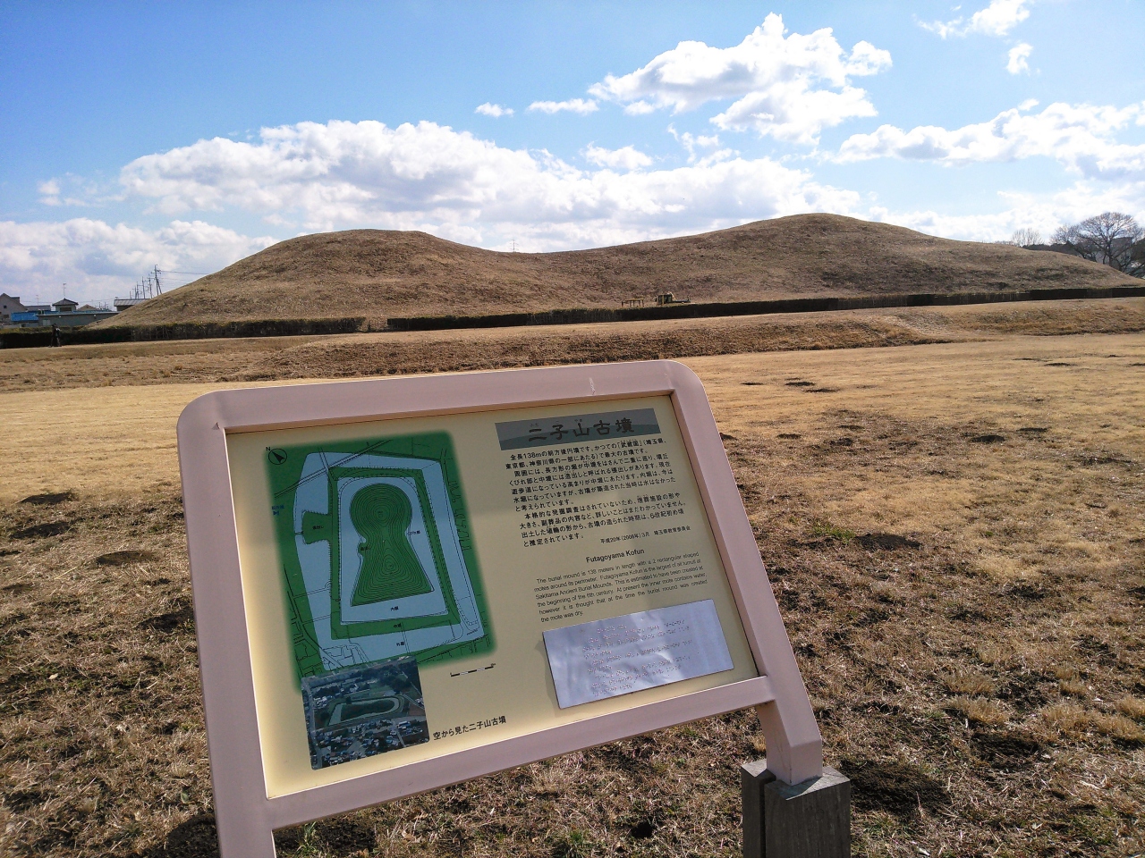 行田市の埼玉古墳公園にある古墳の中でも大きい古墳で、前方後円墳です。形も良く残っていますが、今は周囲が空堀になっています。行ったときは周囲は野原でしたが、時期が良ければポピーの花と一緒に古墳を見ることができます。この古墳には上ることができません。