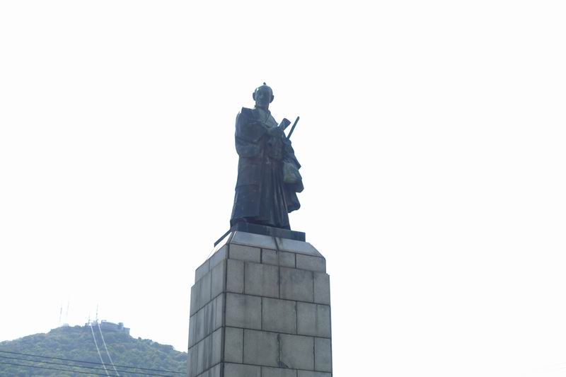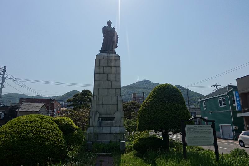 高田屋嘉兵衛は航路や漁場の開拓、廻船業などで財を成し、函館の発展に寄与した人物。大火の際には被災者の救済や復興事業にも貢献。ゴローニン事件では嘉兵衛の尽力によって解決が図られました。護国神社坂の緑地帯に函館山を背にして銅像が建っています。台座が7.5mあり、遠くからでもよく見えます。