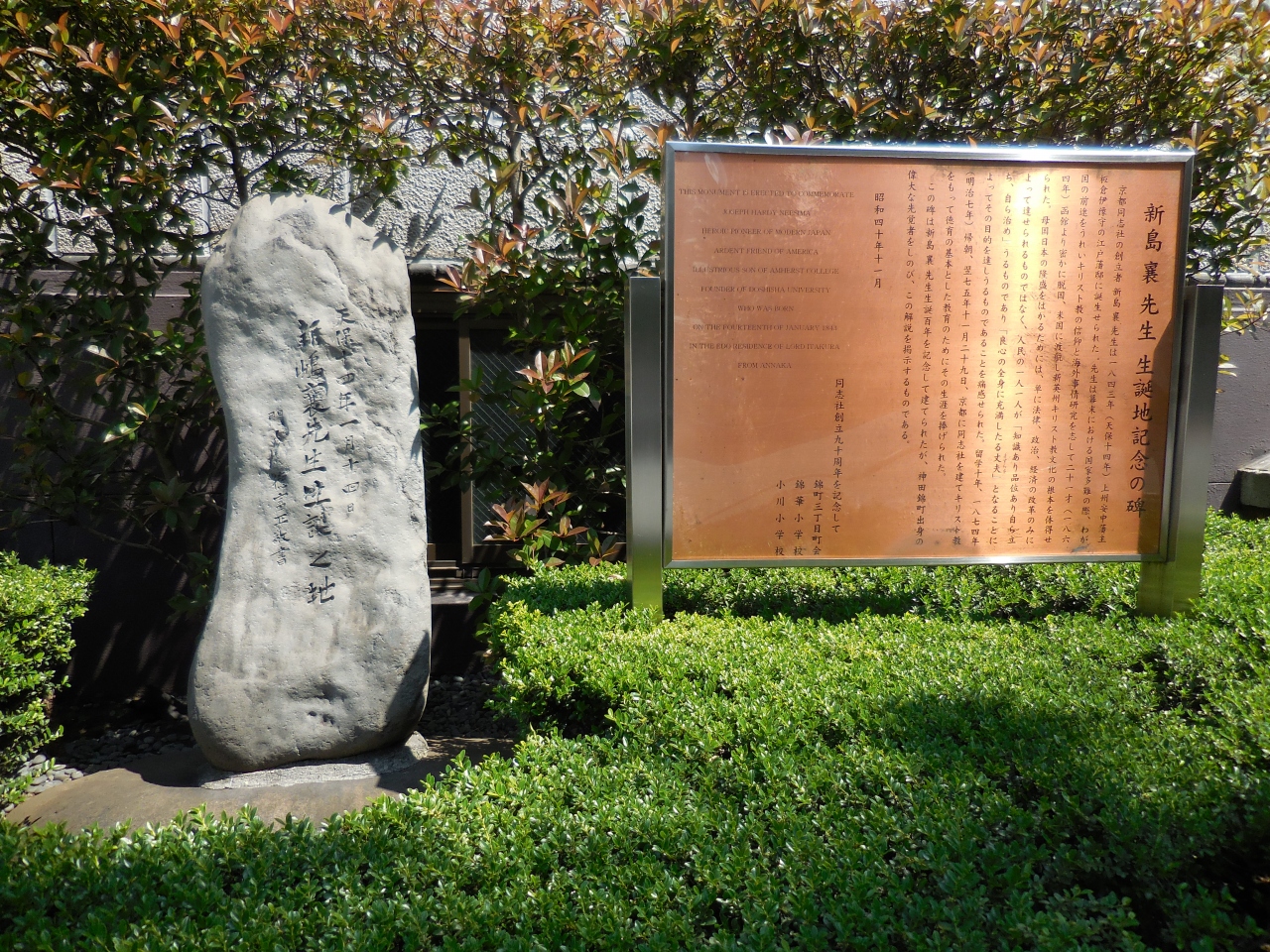 学士会館の敷地の南側、道に面したところにある記念碑です。大河ドラマ「八重の桜」の主人公として有名になった新島八重の夫であり、同志社大学を創立した新島襄は、学士会館付近の上州安中藩江戸屋敷内で生まれたそうです。この記念碑は彼の生誕100年を記念して建立されました。
