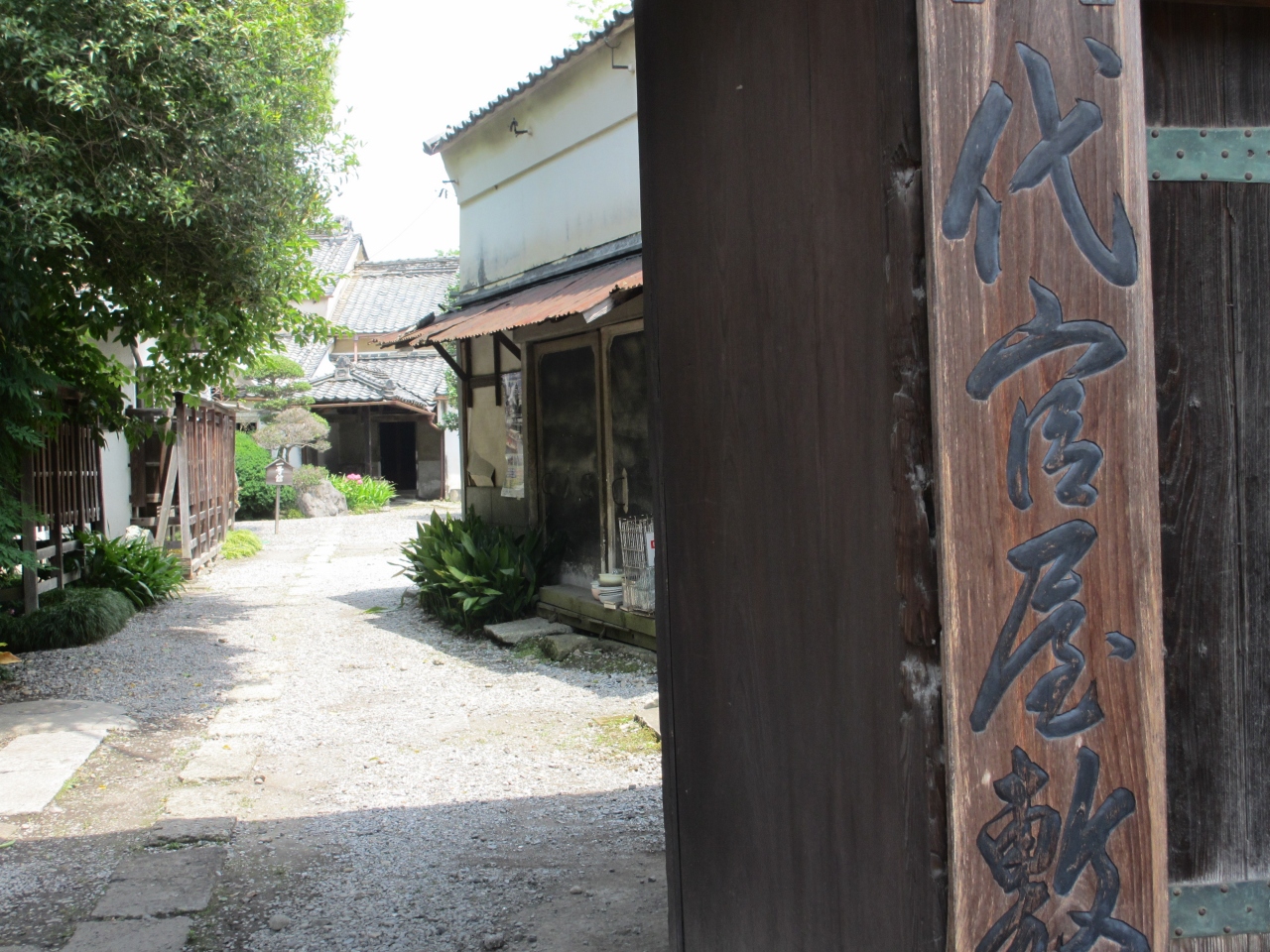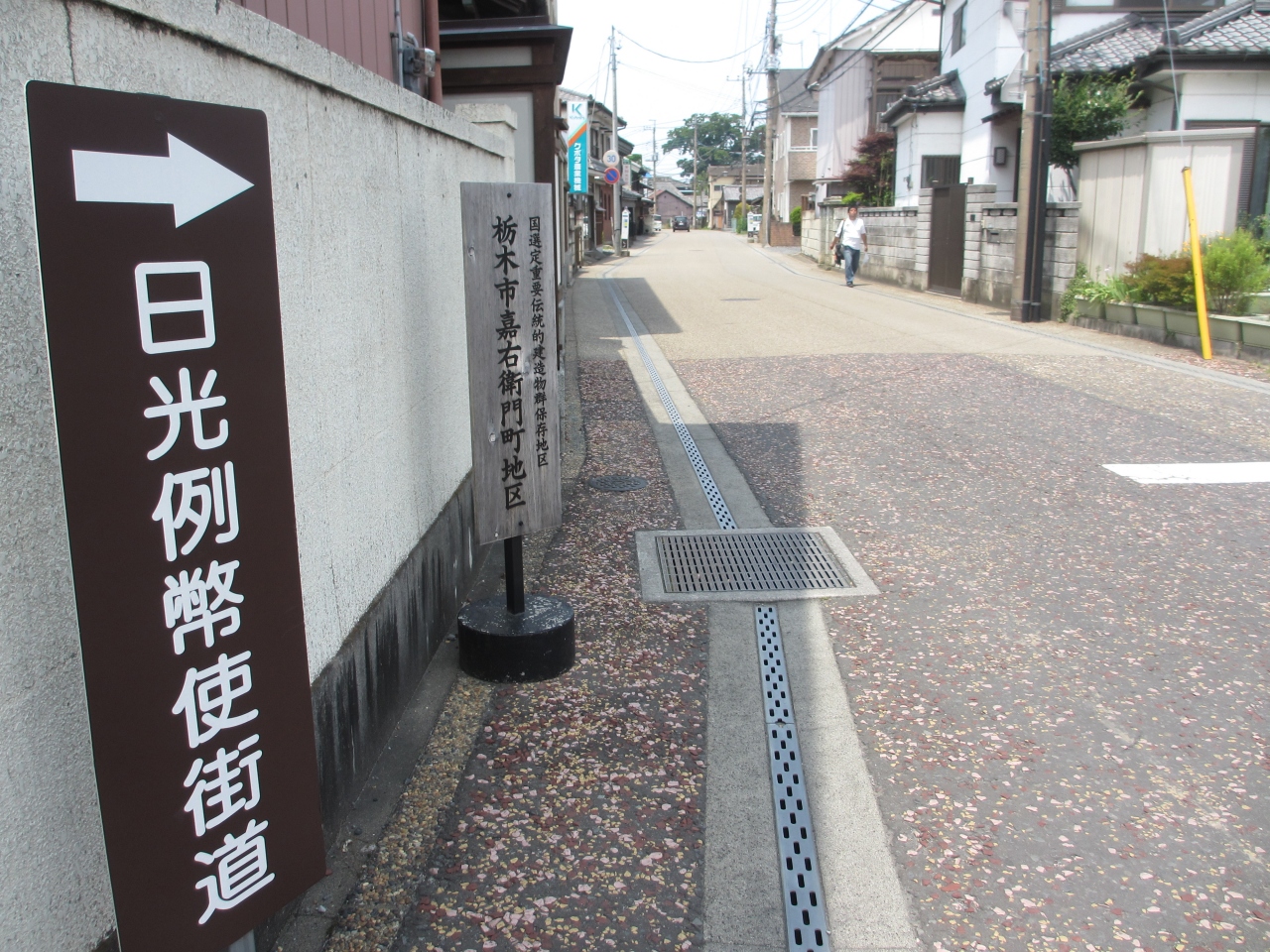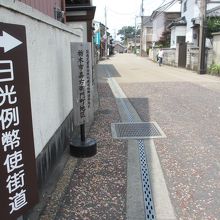 江戸時代、朝廷の勅使が日光に向かう際に使用したことから名づけられた道です。この辺りは重要伝統的建造物群保存地区に指定されています。曲がりくねった道の両側には、蔵のある家や昔ながらの看板を掲げた店が点在し、趣ある雰囲気を作り出しています。