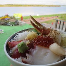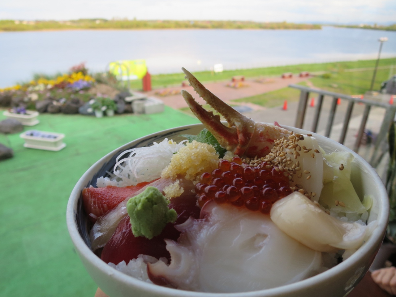 佐藤水産の2階のレストランでは、各種海鮮丼が食べられますが、立ち寄るだけでも名物のジャンボおむすびや塩ソフトなどがいただくことができ、1階の加工品売り場では質の良い海産物が入手できます。