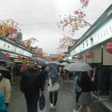 雷門を通り浅草寺の観音堂に行くまでの通りで、両側には土産物屋などが立ち並ぶ浅草で最も混雑している通りだ。この日はあいにくの雨でさほど人出は多くなかったが、外国人観光客や修学旅行の生徒は大勢いた。