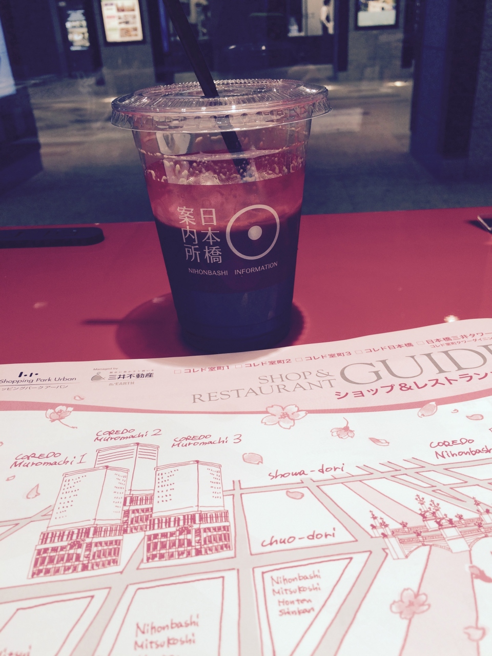 コレド室町地下1階にあります。案内所ですから観光マップもあります。施設内には、カフェや物販のコーナーもあります。私は、休憩を兼ねてカフェで、ショップ&レストランガイドを見ていました。歩き疲れた時の休憩所として上手に利用できます。