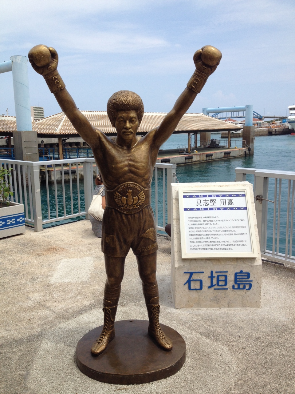 石垣島の離島フェリーターミナルの乗り場に一画に神々しく置かれているのが、具志堅用高さんの銅像です。関東ではお笑い番組に登場するとぼけたおじさんの印象ですが、地元の石垣島では神のような存在のようです。フェリーを待っている間の記念写真の撮影スポットとして最適です。