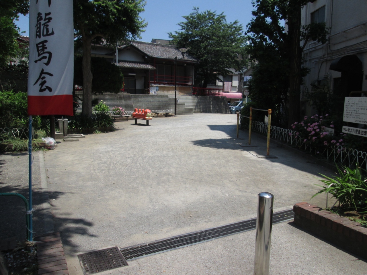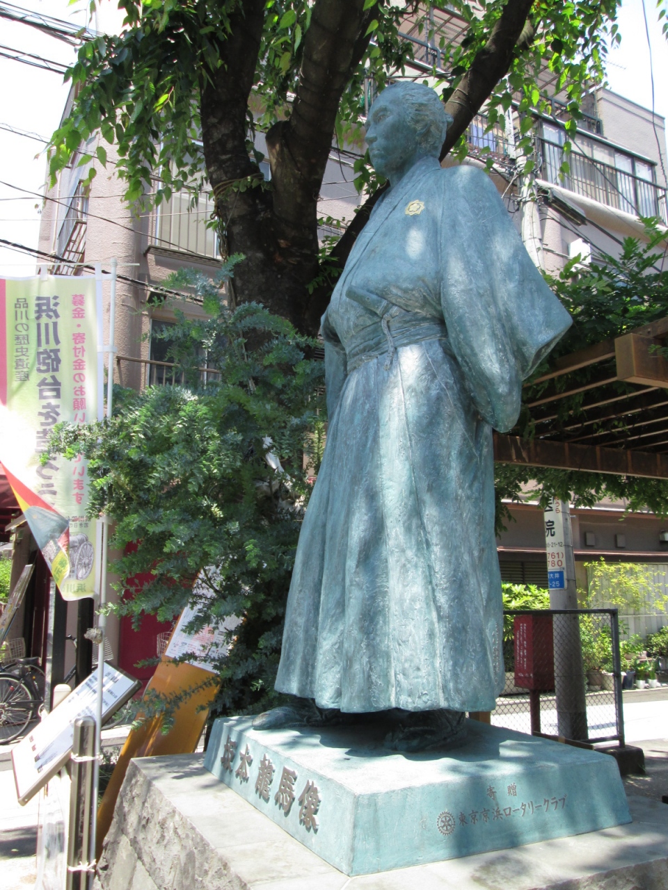 小さなお稲荷さんですが、鳥居の朱色が鮮やかに輝いていました。お稲荷さんの横は、小さな公園になっていて、坂本龍馬の像も建っていました。駅前の憩いの場のような雰囲気がいい感じです。(ベンチもあります)