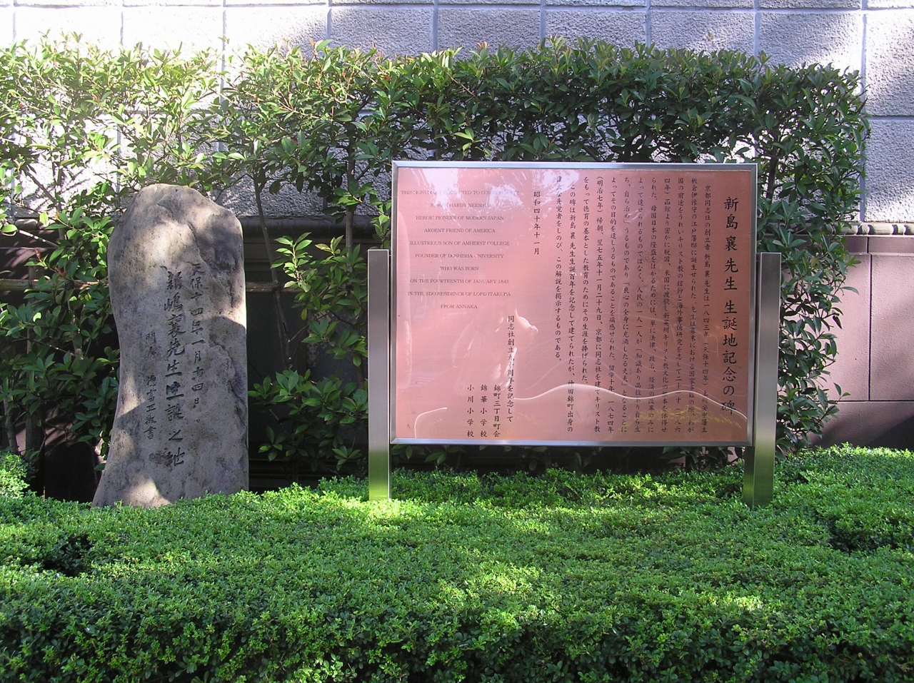 新島襄は1843年、神田の安中藩江戸屋敷に生まれた。女子が4人続いた後の初の男子誕生に喜んだ祖父が「しめた!」と叫んだことから「七五三太(しめた)」と命名されたと言われている。後に敬幹と改名した。「襄」の名は、アメリカに密航するとき、船中でアメリカ人に「ジョー」のニックネームをつけられたことから、以後そう名乗った。