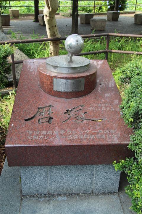 上野弁天堂境内(本堂南側)にあります。碑の上部には「暦」の原点とも言える日時計の文字盤と地球儀を型どったブロンズが備えられています。「暦塚」の題字は当時の首相中曽根康弘氏による揮毫です。弁天堂境内には多くのユニークは碑がたくさんあります。