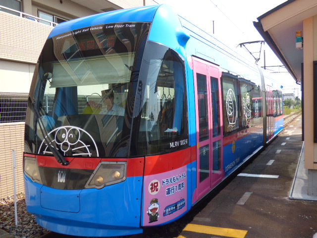 藤子不二雄の出身地高岡に、ドラえもん「生誕100年前」を記念して2012年から万葉線で運行されている青いトラム。乗降口は「どこでもドア」風になっていて、低床式なので車椅子にもやさしい。