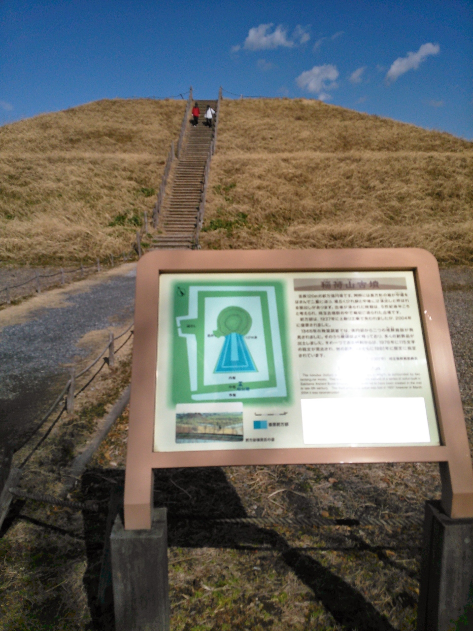 行田のさきたま古墳公園にある前方後円墳で、結構大きいです。公園内の古墳は眺めるだけの古墳もありますが、ここは階段がついており上ることができ、上にはちょっとした広場があります。登ると行田の田園風景や街並みが見えます。
