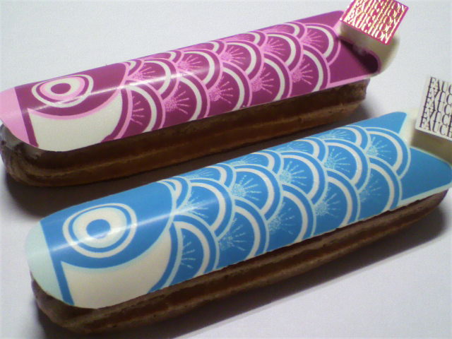エクレール鯉のぼり1つ税込み540円です。ピンクのほうはいちごのクリームが、ブルーのほうはブルーベリーのクリームが入ったエクレアです。かわいいです!