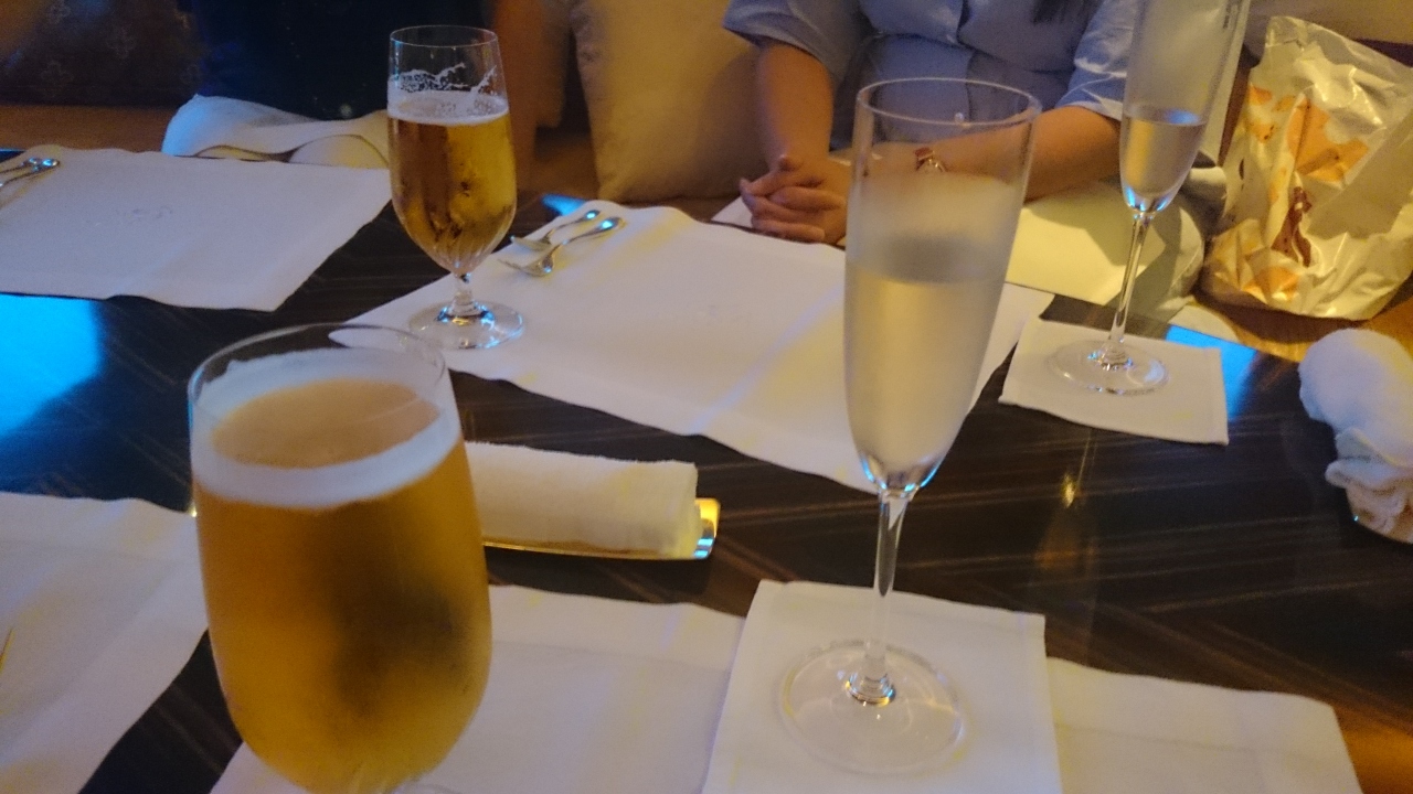 乾杯はシャンパン。これが美味!ワインはスパークリング、赤と白、カクテルも数種類から選べ時間内は飲み放題です。